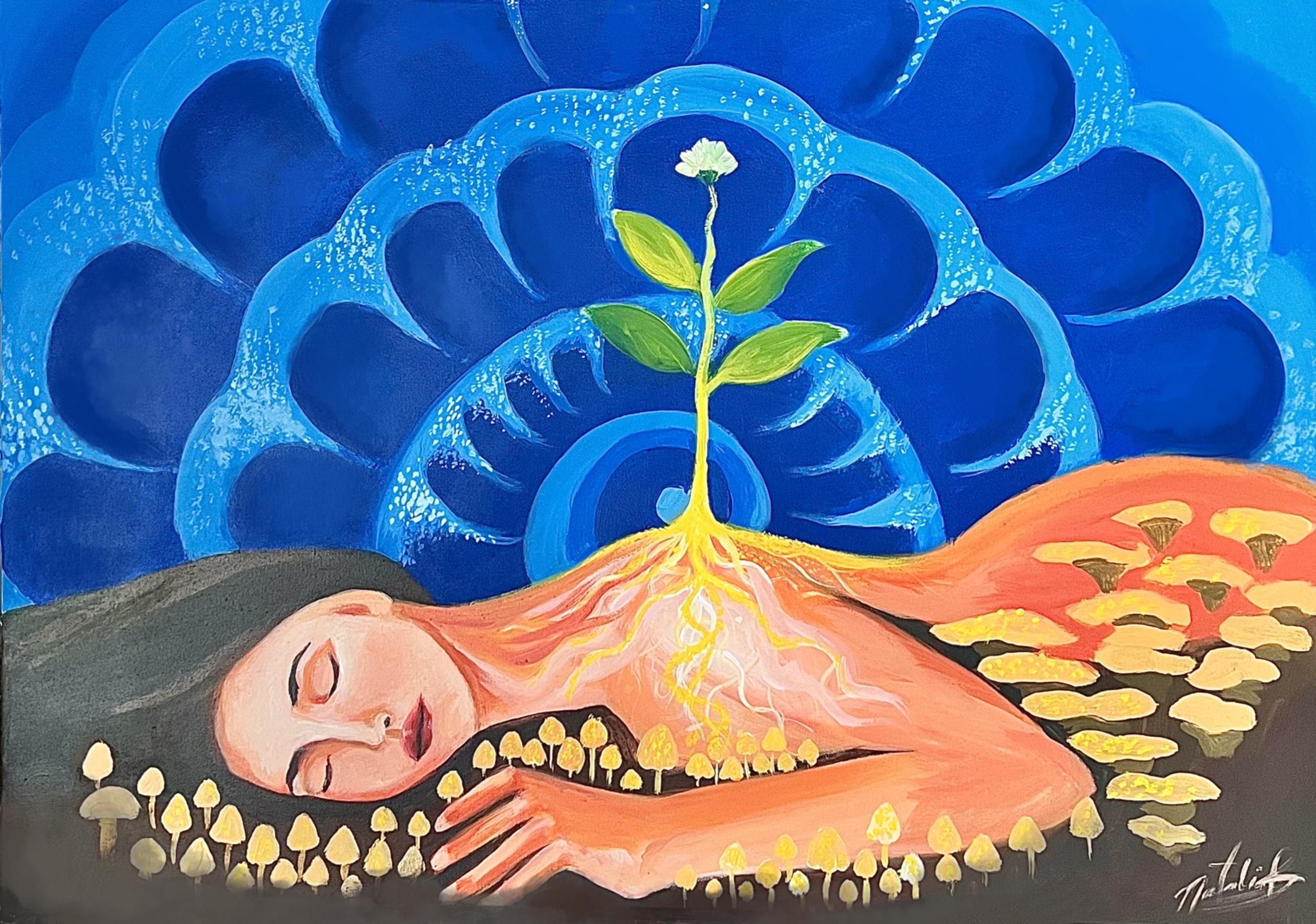 "Ella es la unión entre la tierra y el espíritu. Sus cabellos son raíces que dan vida, su aliento despierta aves y flores. En su silencio habita el mensaje ancestral: somos naturaleza encarnada, un solo pulso entre el cielo y la raíz.