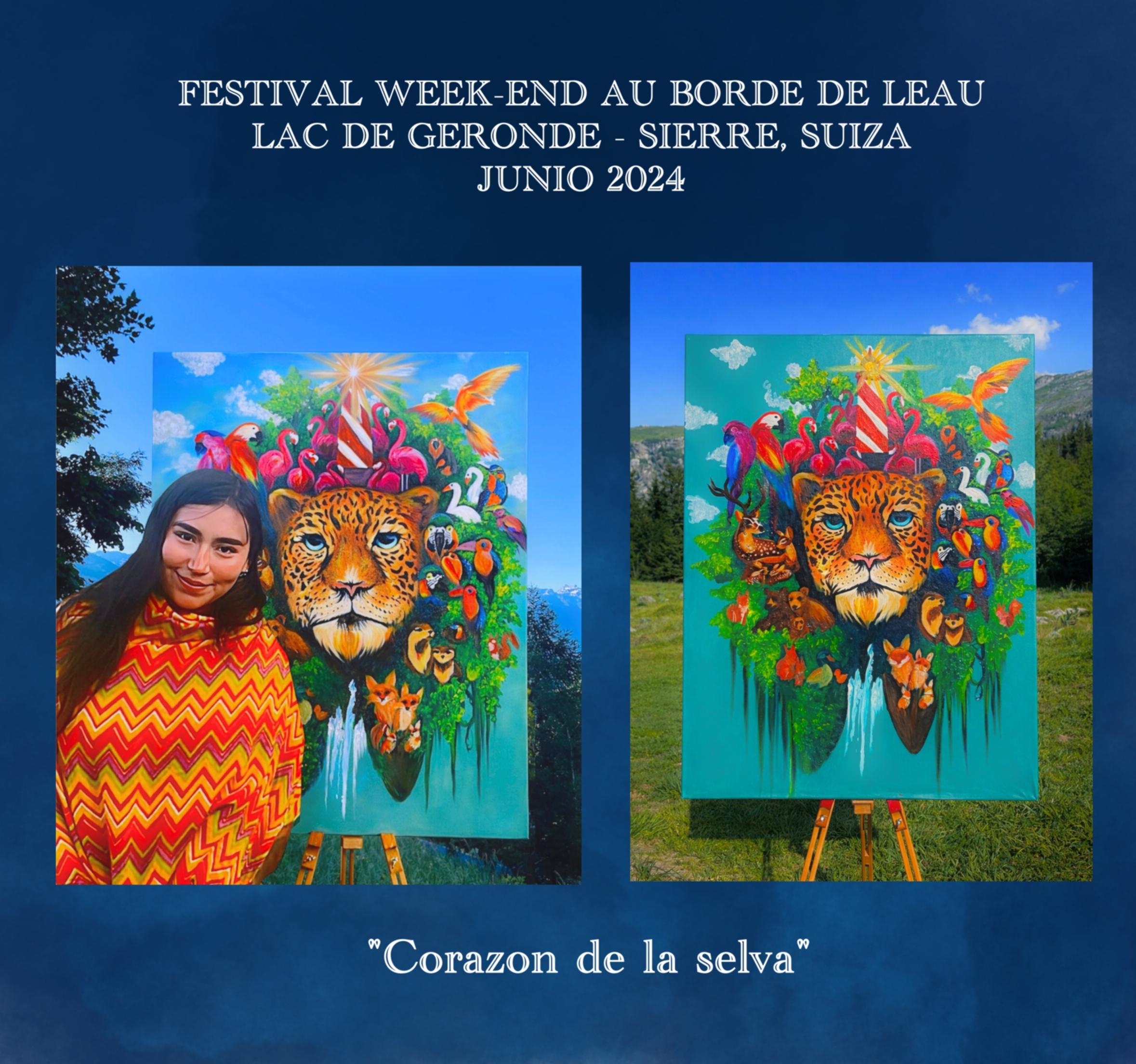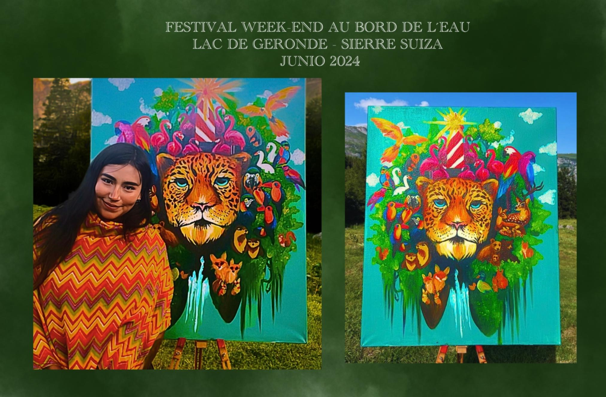 “Participar en el Festival Week-end au bord de l’eau fue una experiencia mágica. Rodeada de naturaleza, música y arte, tuve la oportunidad de compartir mi obra, un homenaje a la conexión entre los animales y la tierra. Esta pintura, protagonizada por un jaguar rodeado de vida y color, representa la fuerza del espíritu natural que habita en todos nosotros. Pintar en este entorno fue un recordatorio de la belleza y armonía que florecen cuando el arte se funde con la naturaleza.”