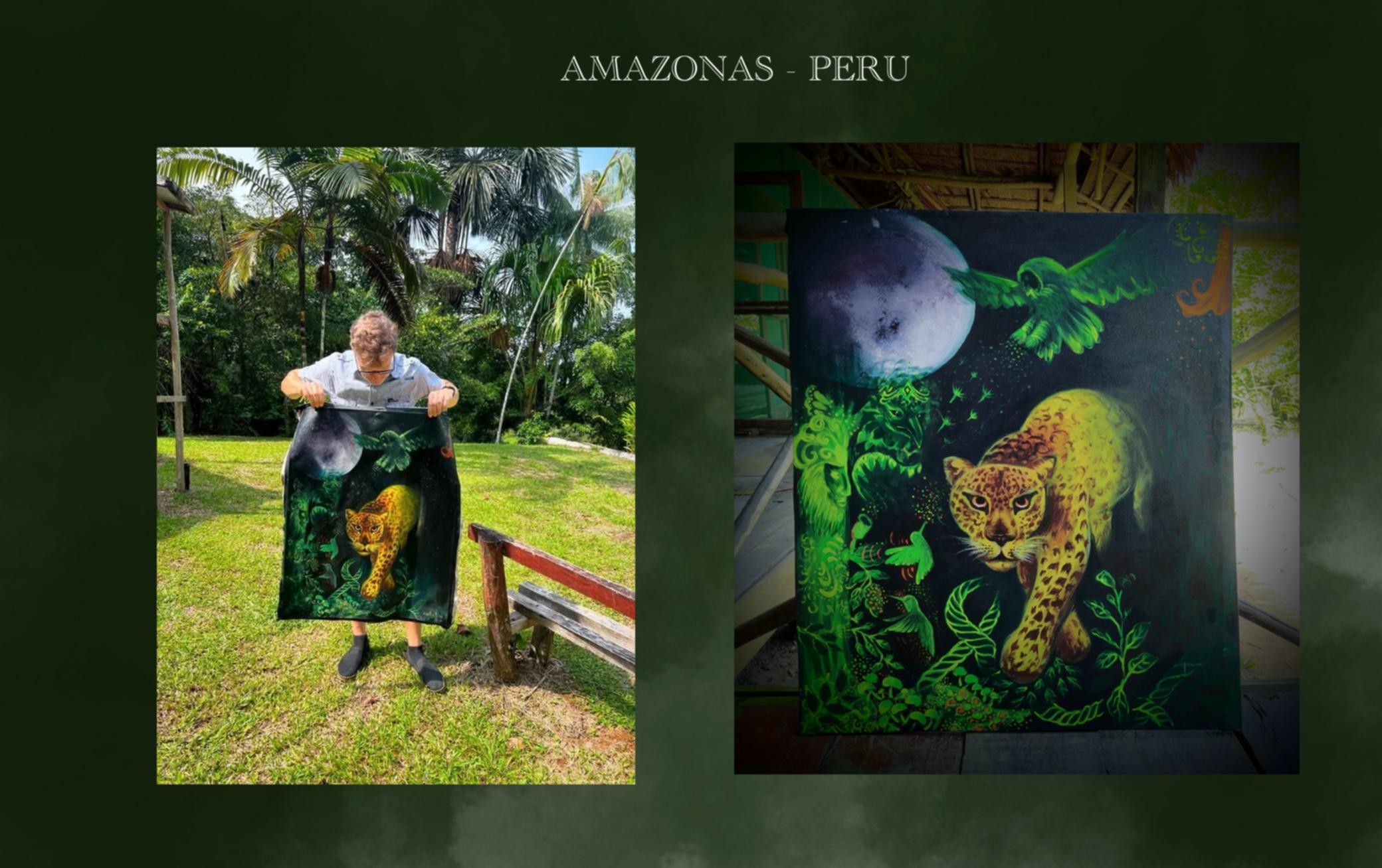Vivir en el Amazonas transformó mi mirada y mi espíritu. Entre los cantos de la selva y el murmullo de los ríos aprendí a escuchar el lenguaje silencioso de la naturaleza. Los chamanes me guiaron en el camino de las plantas maestras, guardianas de sabiduría y equilibrio, y a través de ellas comprendí que cada hoja, cada animal y cada respiración llevan un mensaje sagrado. La ayahuasca me mostró mundos invisibles, me enseñó a ver con el corazón y a pintar con el alma. Mis obras nacen de esas visiones: de la conexión profunda con los espíritus del bosque, del poder de la medicina y del amor por toda forma de vida. En cada trazo intento honrar a la selva, a sus guardianes y a la energía que me reveló el propósito de crear.